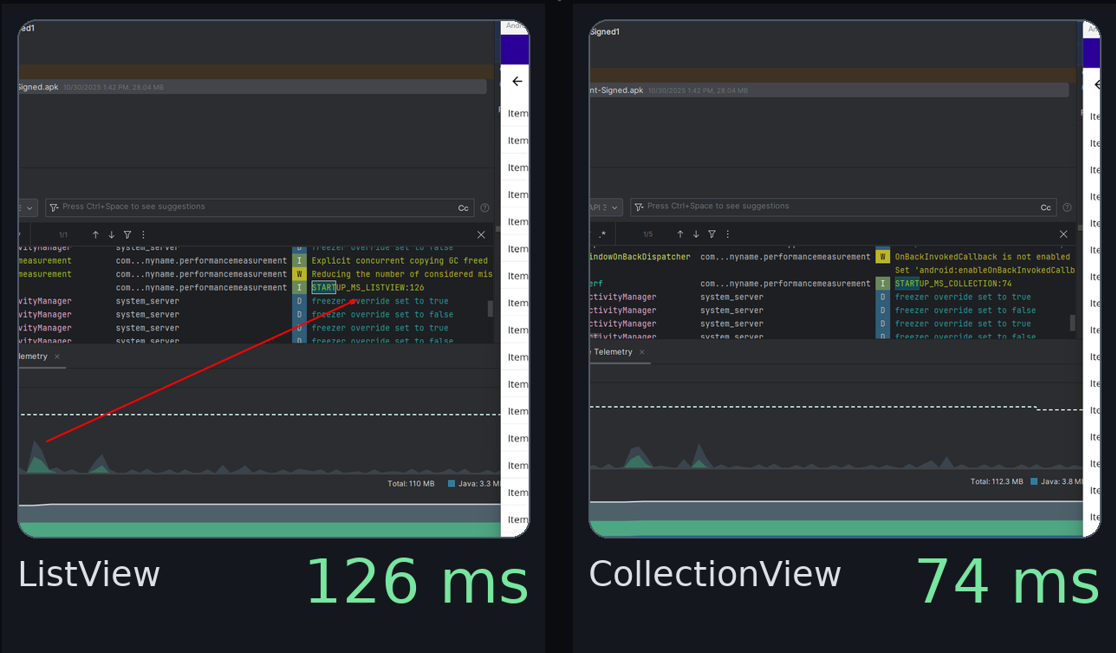Startup results: ListView 126 ms vs CollectionView 74 ms (~41% faster) ⏱️Check the screenshots and notice the difference.